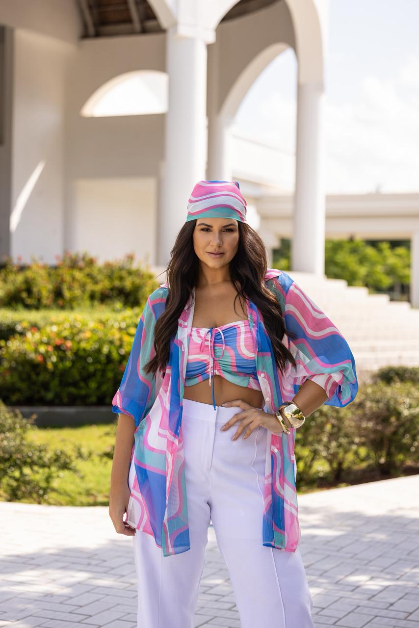 Este conjunto reúne uma camisa, um top e um lenço, criando um look elegante e contemporâneo. A camisa, com corte estruturado, oferece um caimento ideal para diferentes ocasiões, confere sofisticação e facilita a sobreposição. O top, confeccionado em tecido leve e ajustado, valoriza a silhueta com conforto, funcionando como uma base versátil por baixo da camisa.