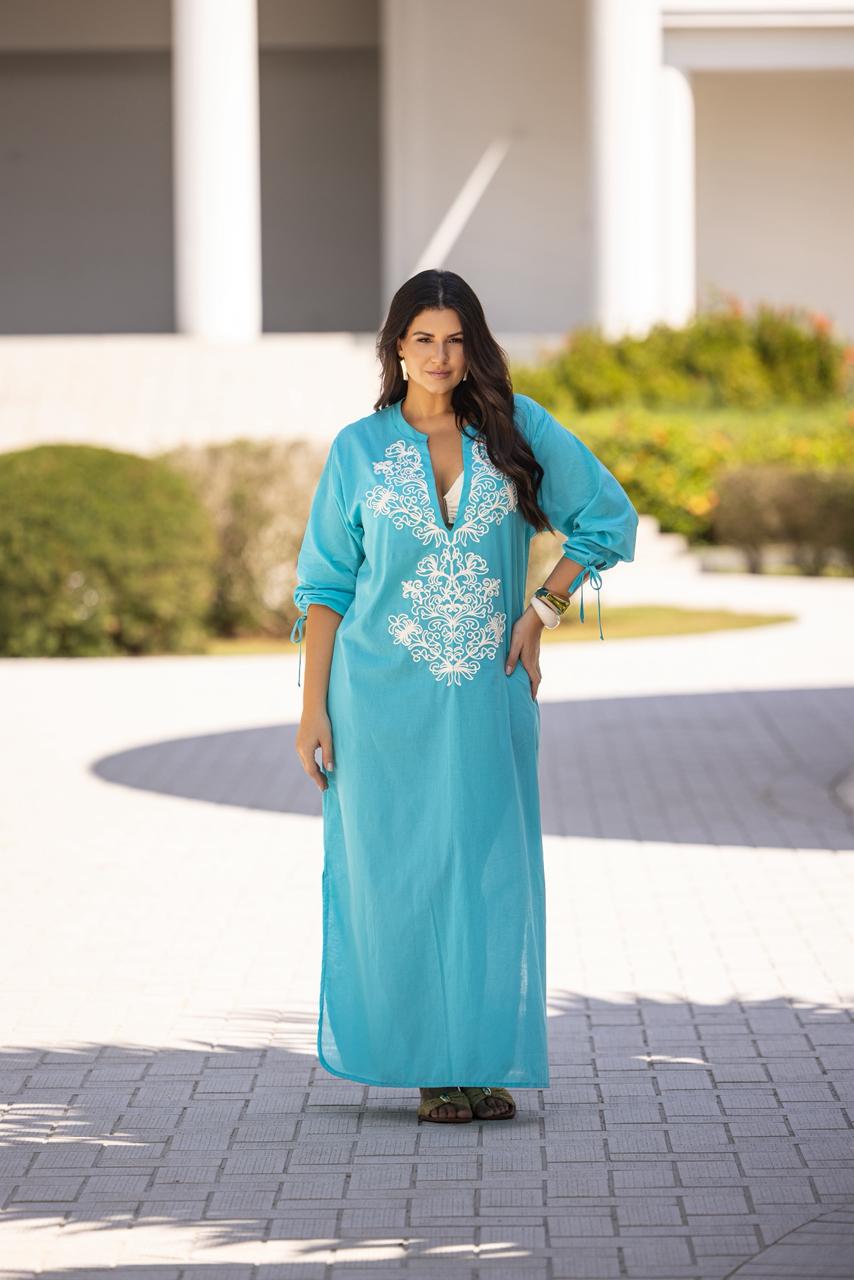 Saída de praia bordada em tecido leve e fluido, perfeita para transições elegantes entre a praia e ambientes sociais. O bordado delicado adiciona sofisticação e movimento, enquanto o comprimento alongado oferece cobertura confortável e estilo versátil. Ideal para quem busca peças que combinam funcionalidade com refinamento, proporcionando liberdade de movimento sem comprometer a elegância. Material respirável garante conforto mesmo em dias quentes.
